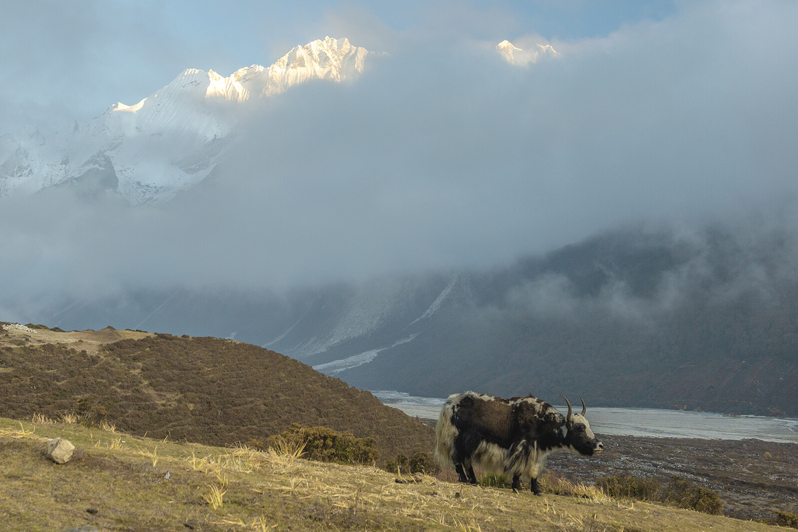 Сегодня конечная цель нашего пути поселок Къянжингомпа (3830м), расположенный у подножия горы Лантанг Лирунг (7227м), в 4-5 километрах от границы с Тибетом. Отсюда начинают свой путь восходители на этот почти неприступный семитысячник. Тропа ведет через альпийские луга, с пасущимися тут красавцами яками, по обе стороны долины нас сопровождают водопады. Сегодня мы пройдем путь около 8 км и наберем высоту 400м.