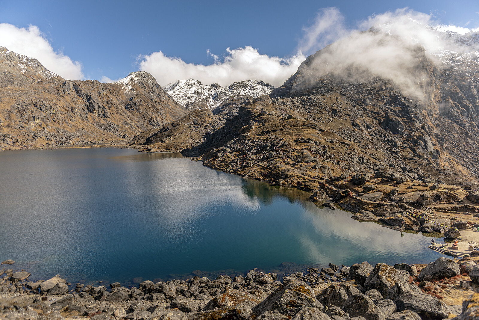 Озеро Госаикунда (в переводе Тысяча Озер) - одно из самых труднодоступных и почитаемых мест паломничества для последователей индуизма в Непале. Тут компактно расположились живописные 17 высокогорных озер, посвященные богам и богиням индуистского пантеона. Самым почитаемым является озеро Шивы, в водах которого происходят чудеса исцеления. Из региона Лантанг к озеру Госаикунда у нас запланирован перелет на вертолете. Тут же нас ждет несложное треккинговое восхождение к озеру Солнца (4 610м) у подножия пика Солнца. Мы будем иметь прекрасную возможность увидеть массивы гор Лантанг Лирунг, Ганеш Химал, Манаслу и Аннапурны.